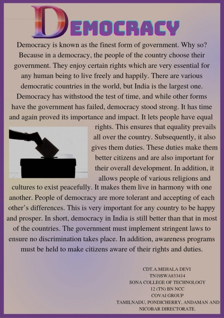 CDT.A.MEHALA DEVI TN19SWA833414 SONA COLLEGE OF TECHNOLOGY 12 (TN) BN NCC COVAI GROUP TAMILNADU, PONDICHERRY, ANDAMAN AND NICOBAR DIRECTORATE.