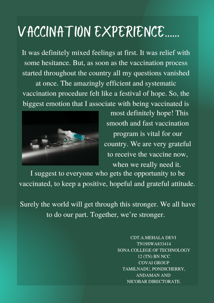 CDT.A.MEHALA DEVI TN19SWA833414 SONA COLLEGE OF TECHNOLOGY 12 (TN) BN NCC COVAI GROUP TAMILNADU, PONDICHERRY, ANDAMAN AND NICOBAR DIRECTORATE.
