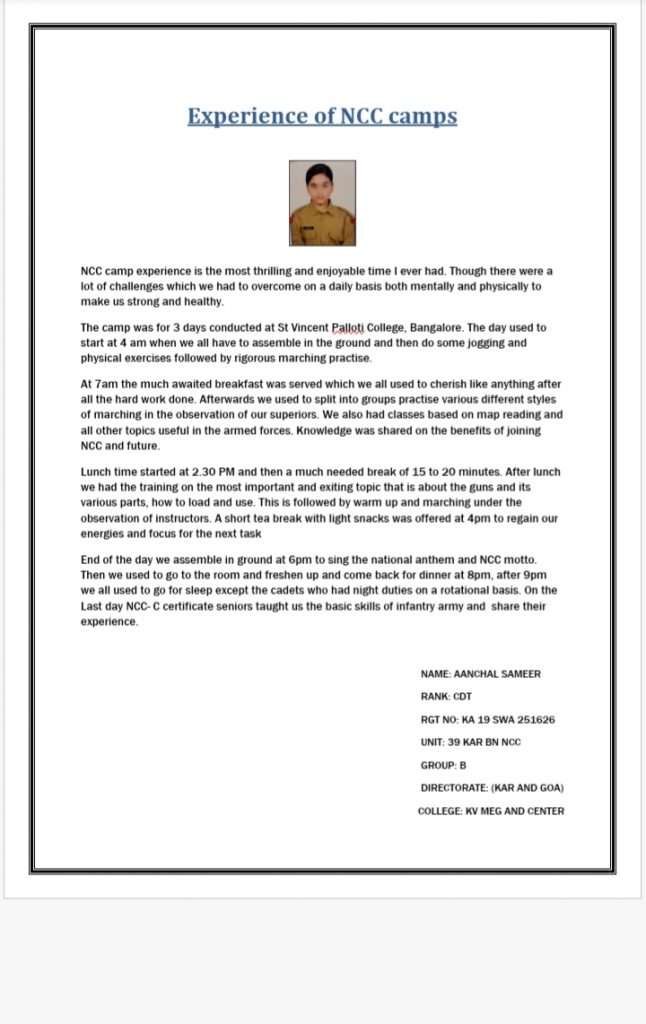 My name is Aanchal Sameer and I am an NCC(SW) cadet from the college KV MEG and centre under the Karnataka- goa directorate. I am glad to share my experience on the camp for B certificate.