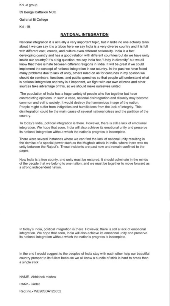 I am cadet abhishek mishra of 39 bbn ncc gariahaat collage and i have given my thoughts upon national integration