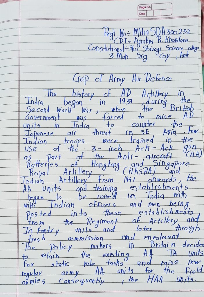 3 MAH SIG COY, AMT TOPIC :- CROP OF ARMY AIR DEFENSE REGT NO :- MH19SDA300252 CDT :- AJINKYA R. KHANDARE CONSTUTIONAL :- SHRI SHIVAGI SCIENCE COLLAGE, AMT