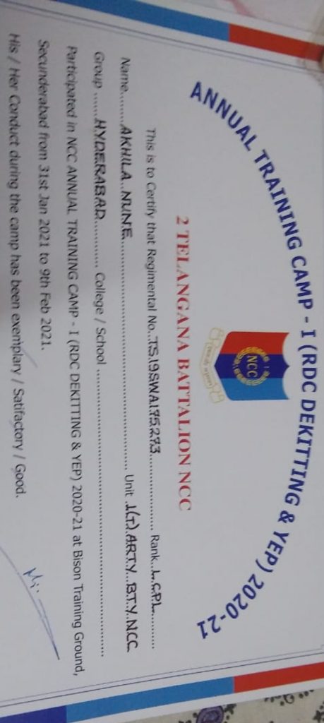 I cadet Akhila nune of 1(T)arty bty of Hyderabad group ap and t dte I have participated in this camp with 9 group's of ap and t and also rdc DKit camp with rdc returns it included group discussion,drill,exam, interview