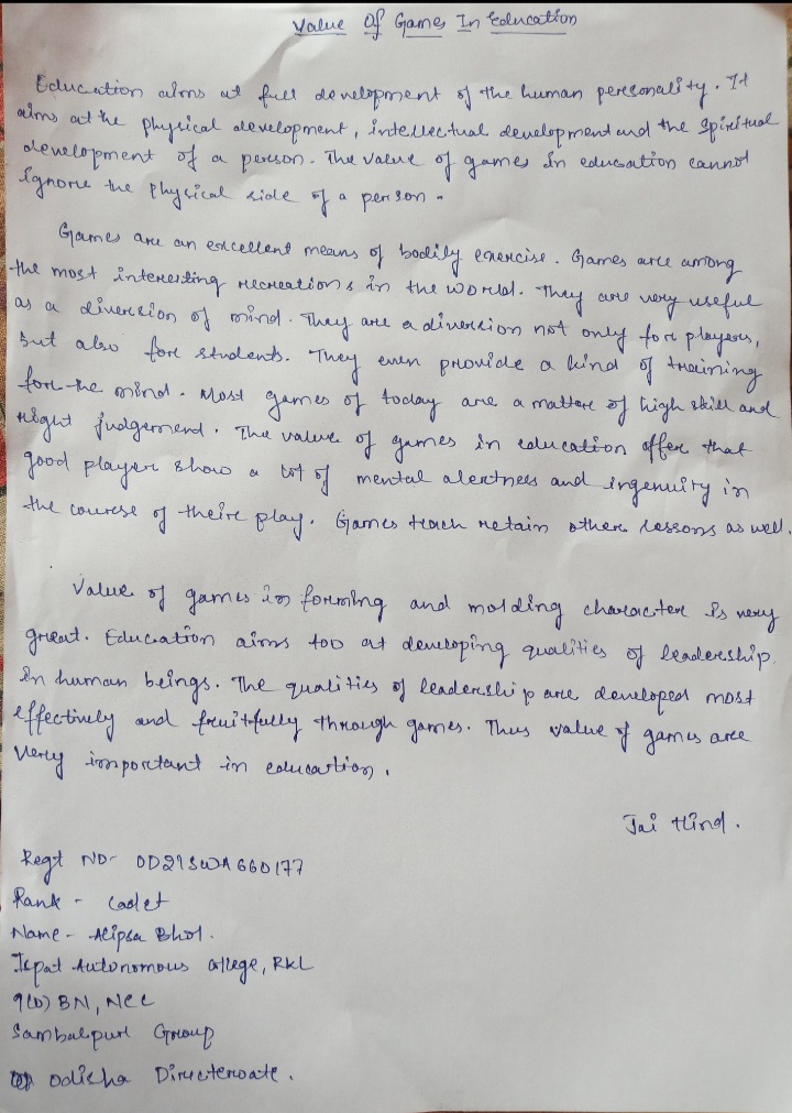 Regt No - OD21SWA660177 Name - CDT ALIPSA BHOL ISPAT AUTONOMOUS COLLEGE, ROURKELA 9(O)BN NCC SAMBALPUR GROUP ODISHA DTE