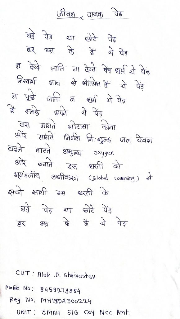 difficult . Free water, forest oxygen and save from this delusional equation (Global warming) True companions, this big tree, small tree, these trees share the priceless earth in every turn, or the age of the earth UNIT:3Mah Sig Coy NCC Amt