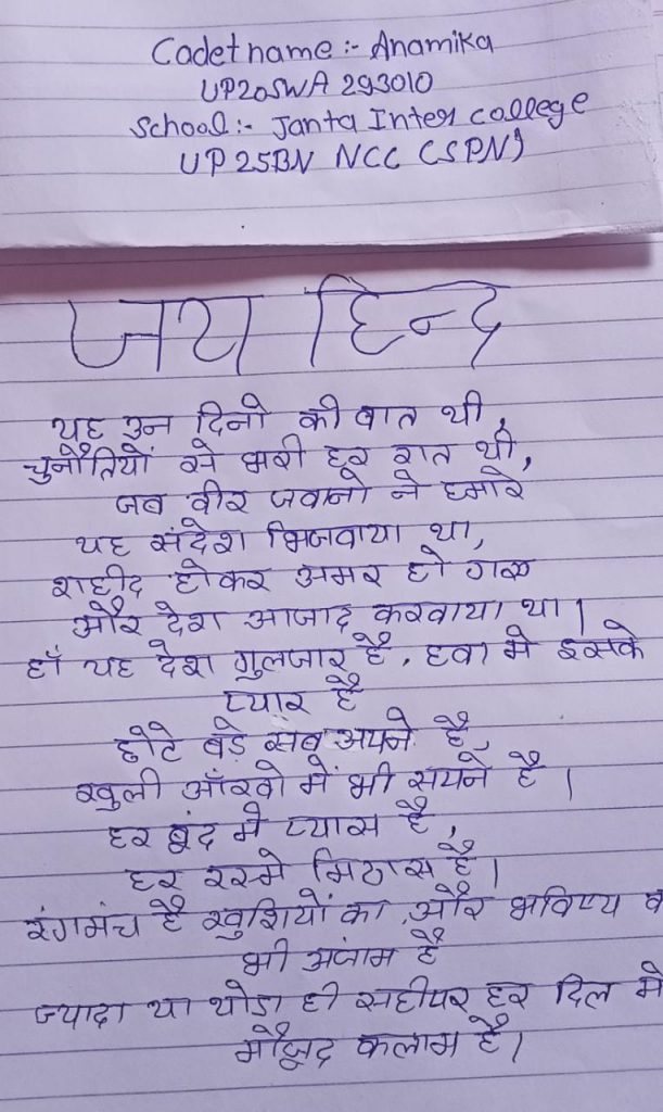 Cadet Name:- Anamika UP20SWA293010 School:- Janta Inter College (S.P.N) UP 25BN NCC(s.p.n)