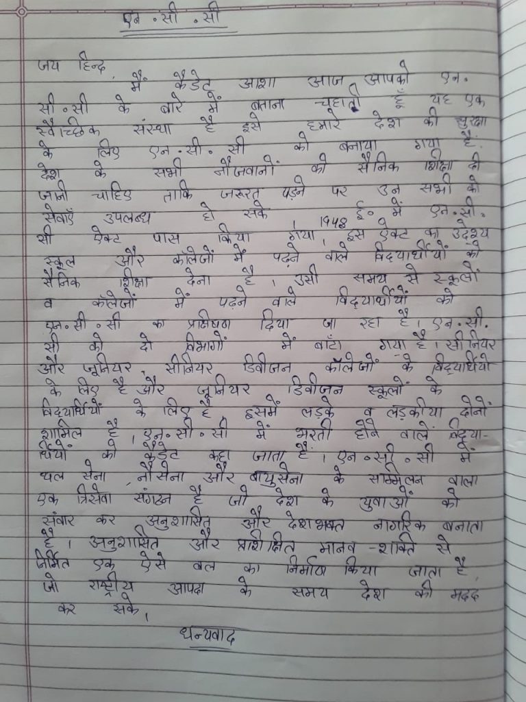 Jai hind! I am cadet Asha of the 3HAR (G) BnNCC HISAR of the Rohtak GP of the PHHP & CDTE. I want to tell about NCC thought this article please have a look here too.