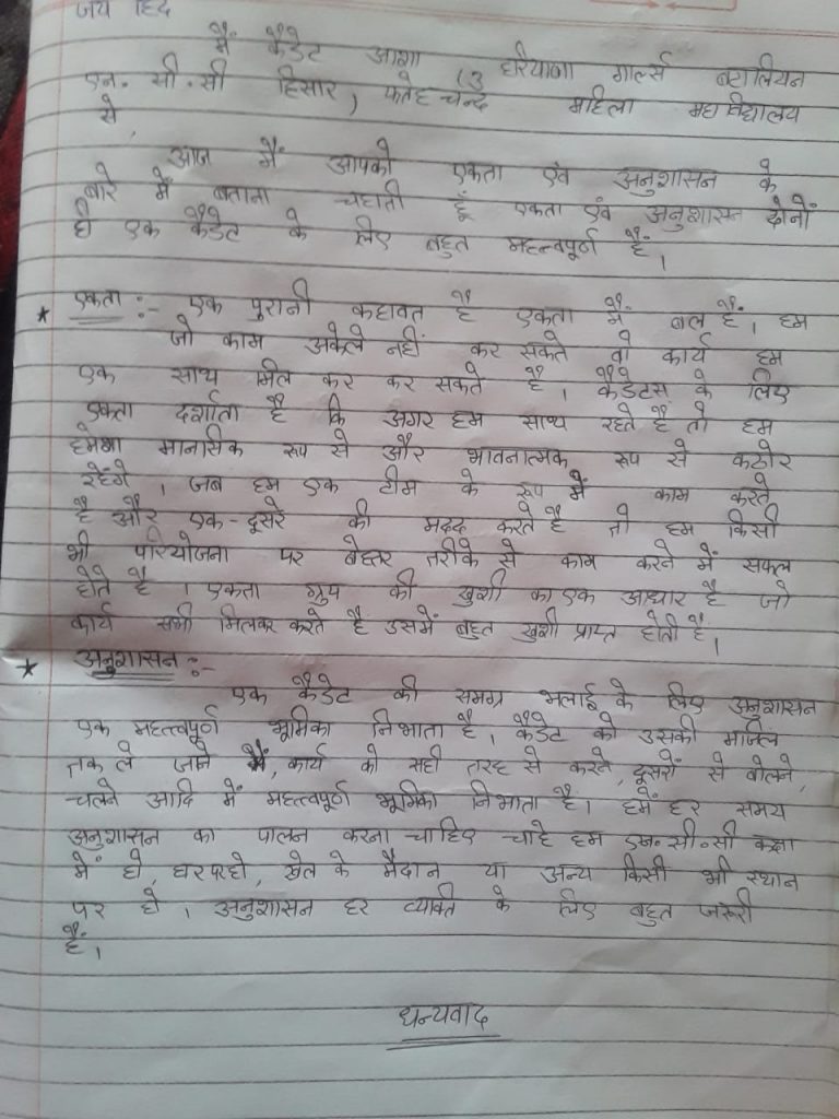 Jai hind! I am cadet Asha of the 3HAR (G) BN NCC HISAR of the Rohtak GP of the PHHP C & DTE. I want to tell you about unity and discipline through this article, please see it.