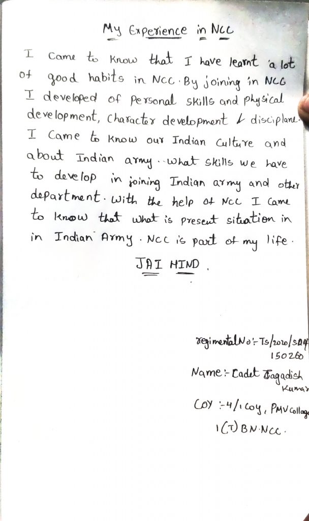 Cadet Jagadish Kumar TS/2020/SDA/150260 1/4 Coy 1(T) battalion PMV college