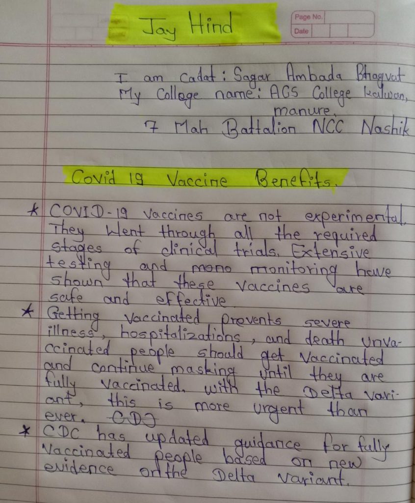 Name - Sagar Ambadas Bhagwat. Reg.no- MAH/20/SD/A/707295 ANO - Lt. B.C.Kachhava Unit - 7.Mah.Bn.NCC.Nashik Institution - ACS College Kalwan
