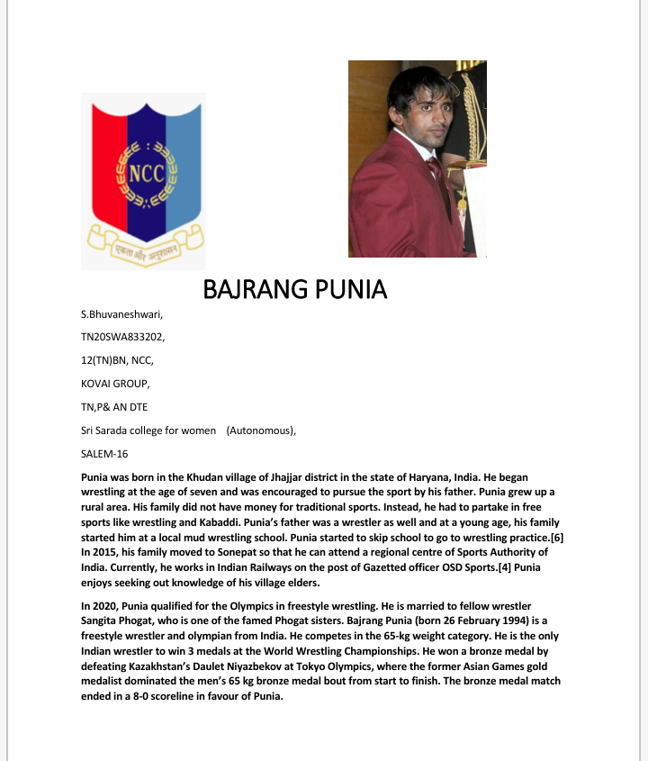 S.Bhuvaneshwari, TN20SWA833202, 12(TN)BN, NCC, KOVAI GROUP, TN,P& AN DTE Sri Sarada college for women (Autonomous), SALEM-16