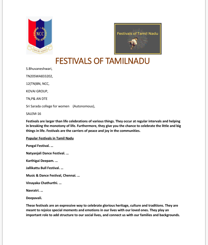 S.Bhuvaneshwari, TN20SWA833202, 12(TN)BN, NCC, KOVAI GROUP, TN,P& AN DTE Sri Sarada college for women (Autonomous), SALEM-16