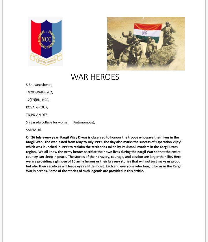 S.Bhuvaneshwari, TN20SWA833202, 12(TN)BN, NCC, KOVAI GROUP, TN,P& AN DTE Sri Sarada college for women (Autonomous), SALEM-16