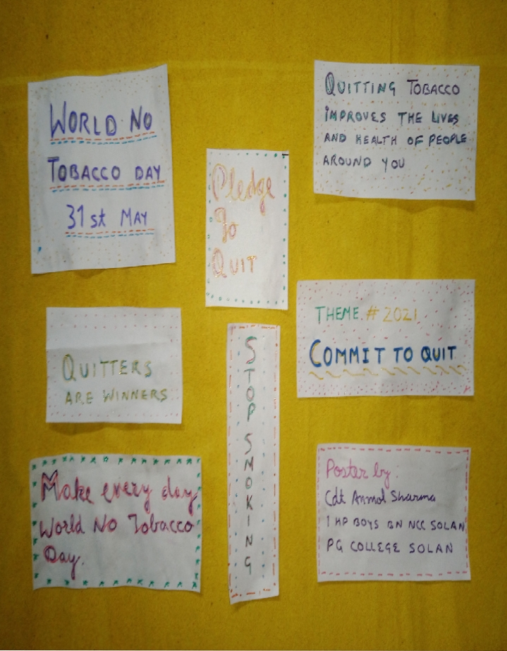 I Cdt Anmol Sharma ,Cdt no HP/SD/19A/280026 of 1 HP BOYS BN NCC SOLAN,doing graduation from PGC SOLAN. On the occasion of World No Tobacco Day, spreading awareness of the ill effects of tobacco in our lives.