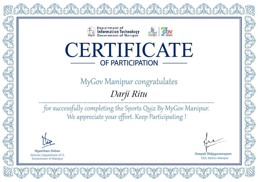 I GJ19SWA102572 CDT darji rituben hasmukhbhai OF 1 GUJ girls bn NCC AHD./Ahd group/guj directorate is presentinga photo the Sports quiz by mygov Manipur certificate