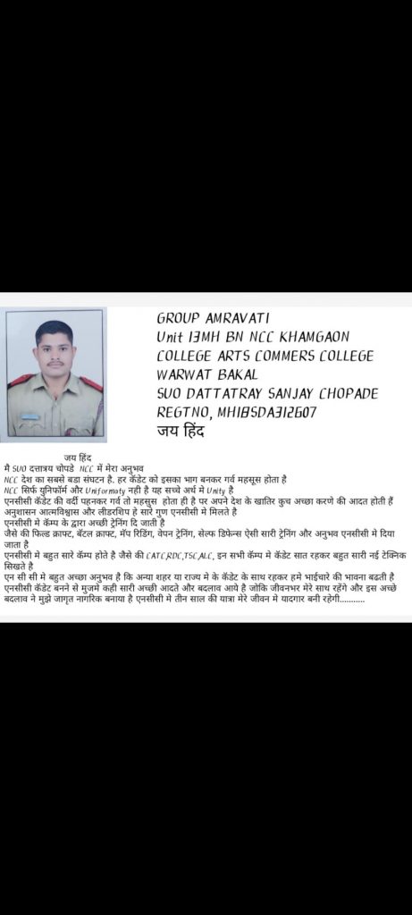 SUO DATTATRAY SANJAY CHOPADE COLLEGE NAME ARTS COMMERCE COLLEGE WARWAT BAKAL GROUP AMRAVATI UNIT 13MHBNCCKHAMGAON REGT NO MH18SDA312607