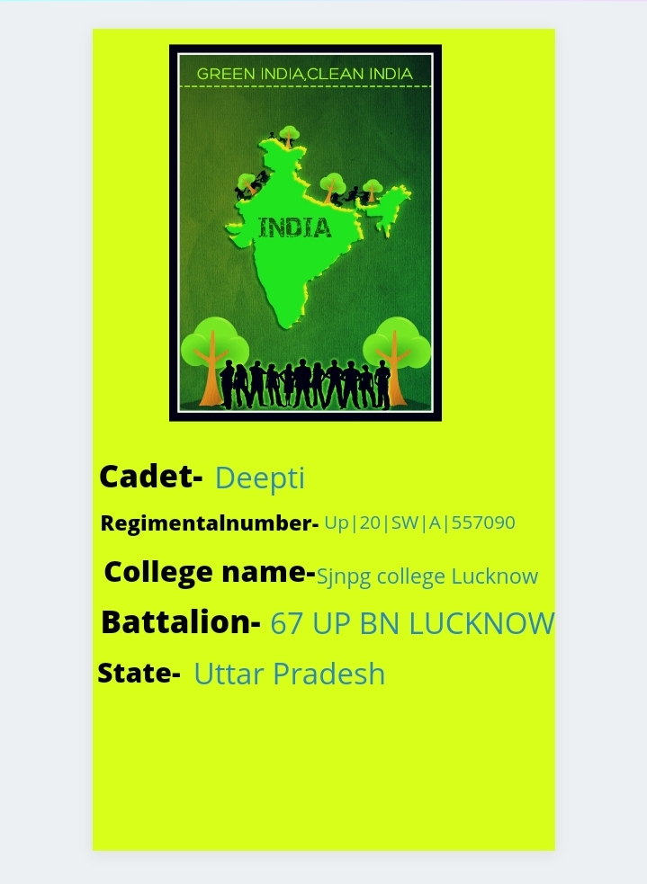 I am NCC cadet deepti form 67 UP BN LUCKNOW . recently I am doing my graduation from Shri jai Narayan PG College Lucknow.