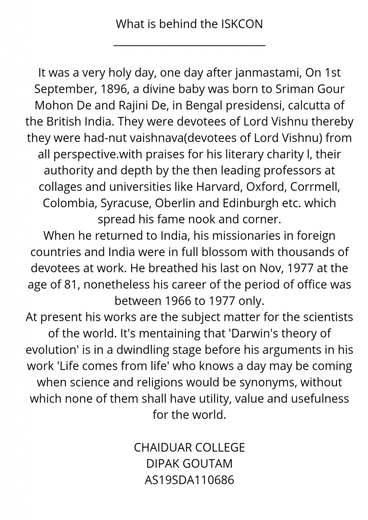 From Chaiduar college 5Assam Bn NCC tezpur Dipak Goutam I have written What is behind the ISKCON