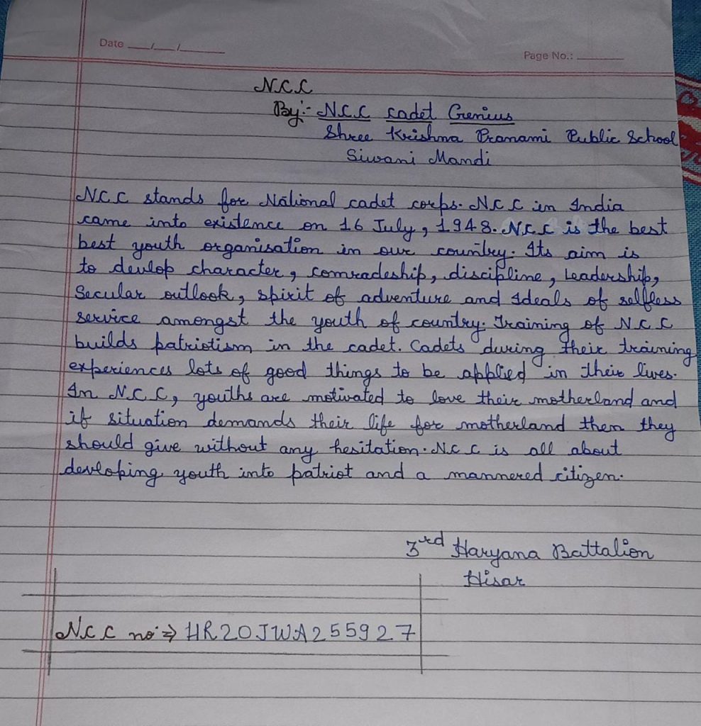 JAI HIND SIR/MA'AM I NCC CADET GENIUS FROM SHREE KRISHNA PRANAMI PUBLIC SCHOOL SIWANI MANDI.. I WROTE ARTICLE ON NCC.. THIS ARTICLE IS ALL ABOUT THE AIM OF NCC AND THE THINGS THAT A CADET LEARNS IN TRAINING..