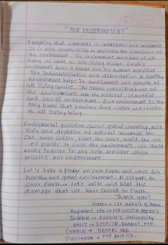 CDT-HARDIK ATARA Regiment No-MP20SDA/111007 Institute-Peoples University Unit-1MP CTR, Bhopal Group-Bhopal Group Directorate-MP AND CG