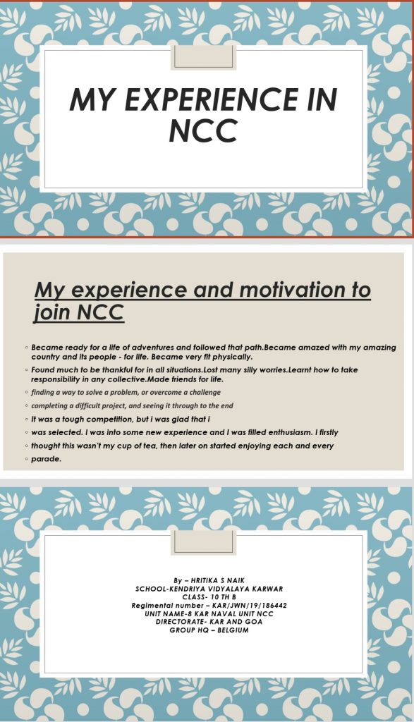 By – HRITIKA S NAIK SCHOOL-KENDRIYA VIDYALAYA KARWAR CLASS- 10 TH B Regimental number – KAR/JWN/19/186442 UNIT NAME-8 KAR NAVAL UNIT NCC DIRECTORATE- KAR AND GOA GROUP HQ – BELGIUM