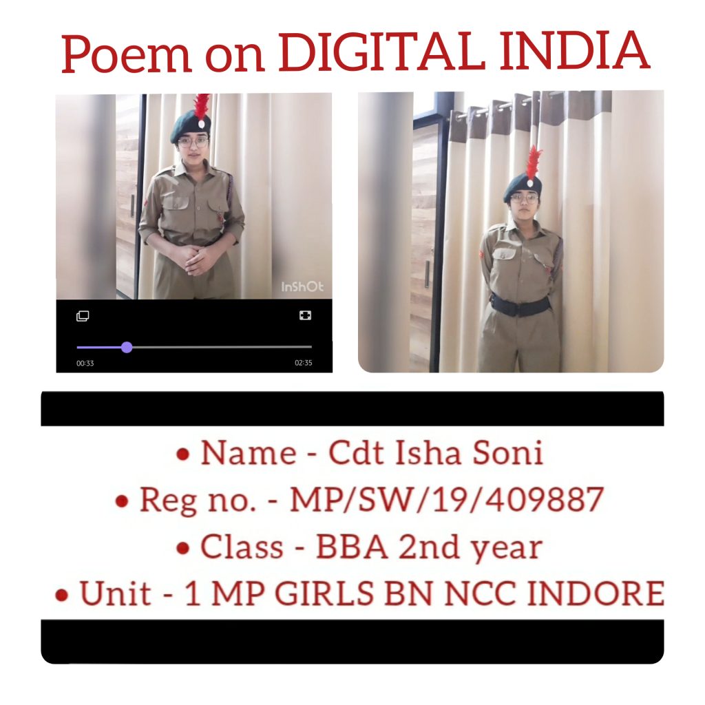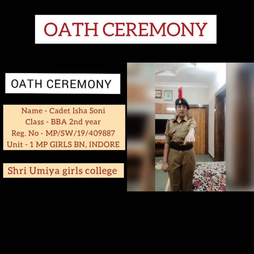 I remember how i came to home just for holi & stayed home for 1 year. NCC taught me discipline in regardance of my work. CADET ISHA SONI REG NO. - MP19SWA409887 SHRI UMIYA KANYA MAHAVIDHYALYA 1 MP GIRLS BN NCC, INDORE JAI HIND ??