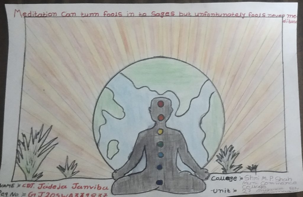 I CDT JADEJA JANVIBA FROM SHRI M. P. SHAH MUNI. COMMERCE COLLAGE , 27 GUJART BN NCC JAMNAGAR , GUJARAT DIRECTORATE CARING A POSTER ON INTERNATIONAL YOGA DAY