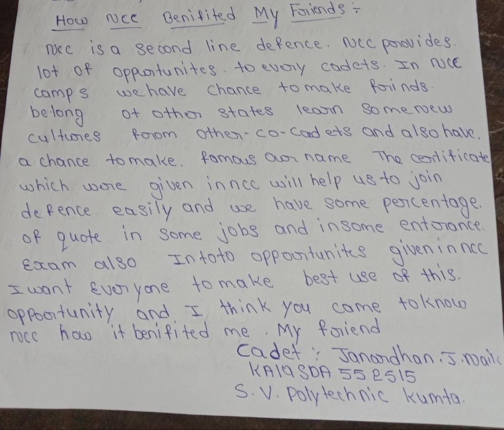CADET: JANARDHAN J NAIK KA19SDA552515 UNIT:4/29 A COY KAR NCC GPHQ: BALGAM DTR: KARNATAKA &GOA