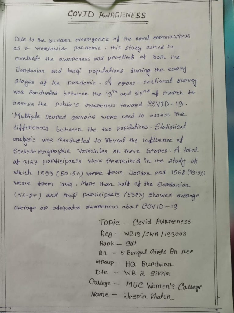 Name - Jasmin khatun Reg no - WB19/SWA/193008 Rank - cdt Bn - 5 Bengal Girls BN Ncc Group - HQ Burdwan Dte - WB & Sikkim College - MUC Women's College