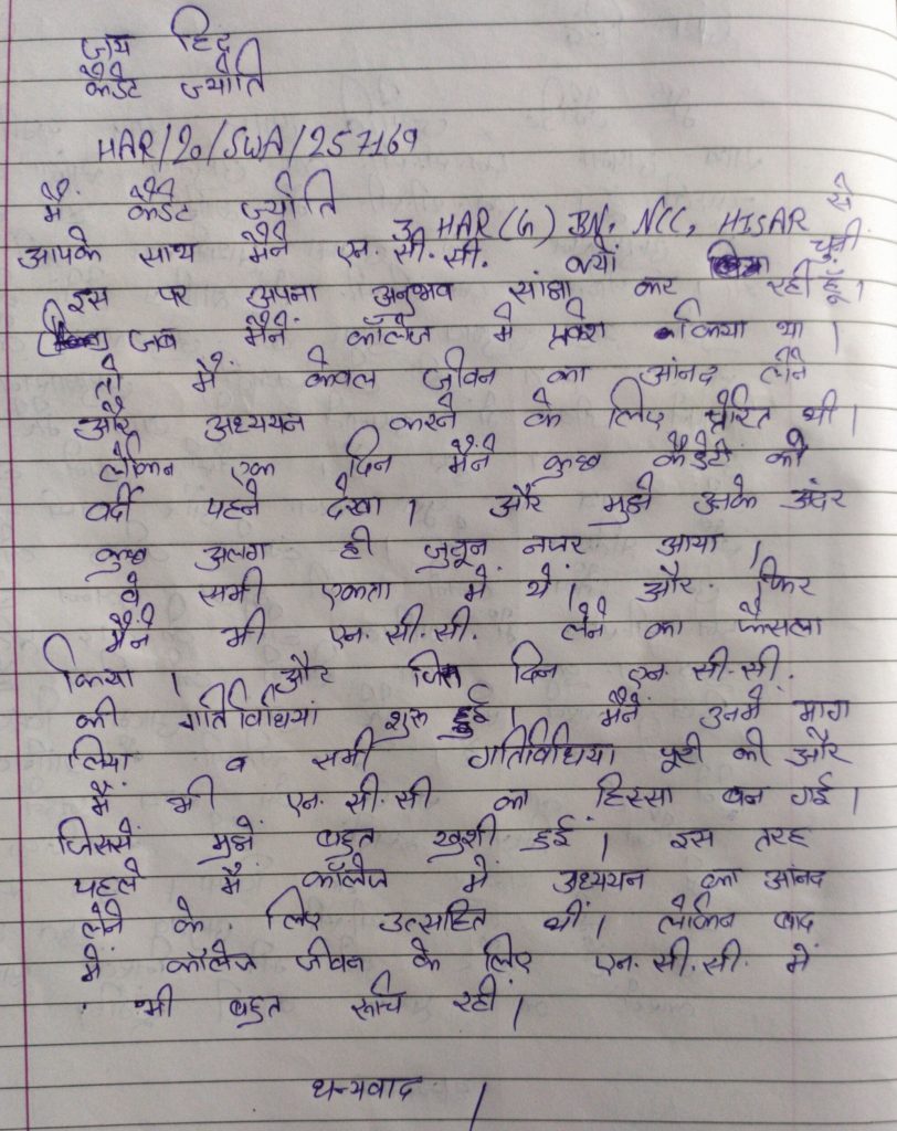 जय हिंद मैं कैडेट ज्योति 3HAR (G) BN NCC, Hisar आज आप सभी को एनसीसी क्यों चुनी इसके बारे में बताना चाहती हुं
