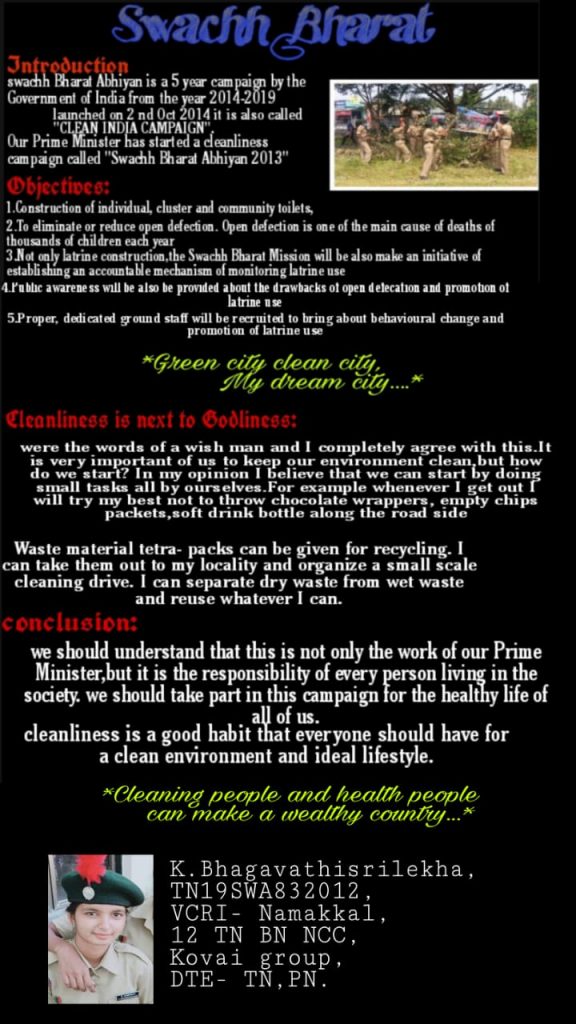 TN19SWA832012, Cadet:K.Bhagavathisrilekha, VCRI-NAMAKKAL, 12 TN(BN) NCC, Kovai-Group, DTE-TN ,P&AN.