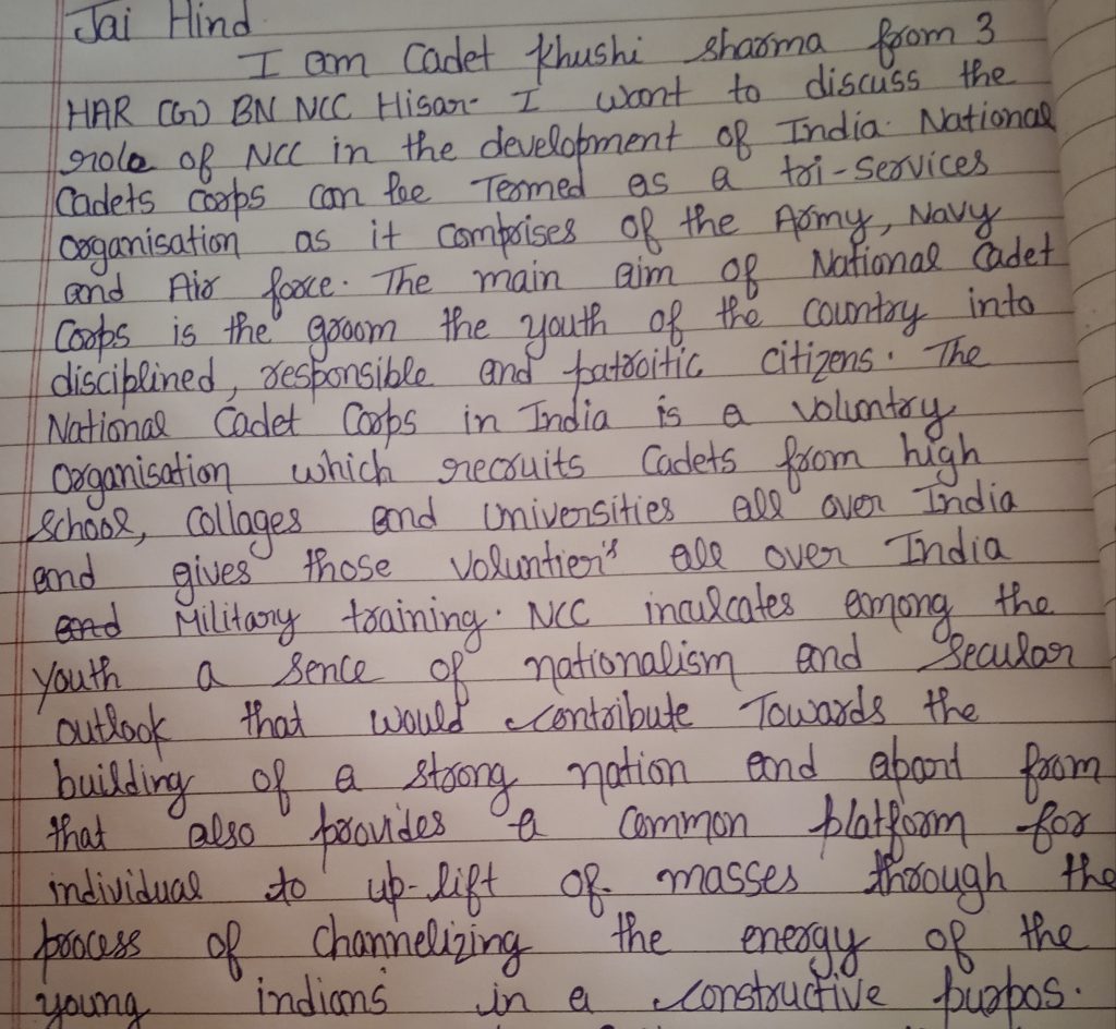 JAI HIND I am cadet khushi sharma from 3HAR (G )BN NCC Hisar. Here I want to share the role of NCC in the development of india