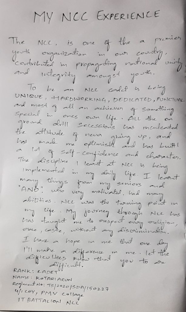 RANK:CADET. NAME:Kotari Arun. REGIMENT No:TS/2020/SDA/150227. 4/1 COY , Pragathi Mahavidyalaya degree college. 1T BATTALION NCC.