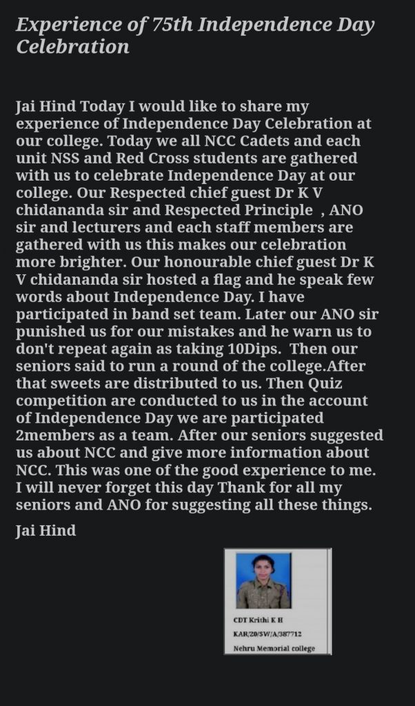 CDT Krithi K H KAR/20/SW/A/387712 Nehru Memorial College, Sullia