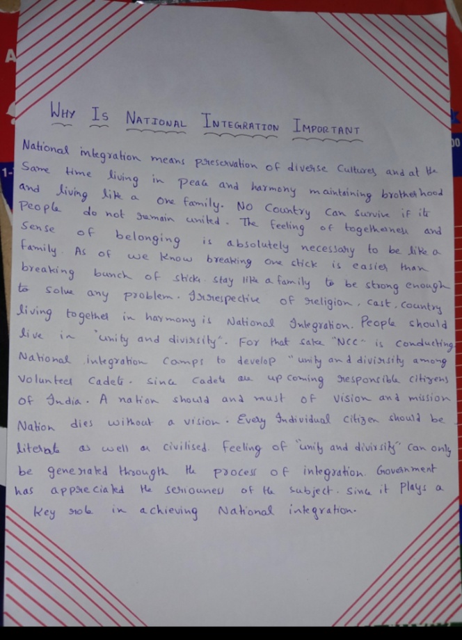 This is Cadet kunde kiran kumar from AP AND T directorate, Hyderabad group,1(T) AIR SQN NCC ,I have written about national integration and it\\\'s importance