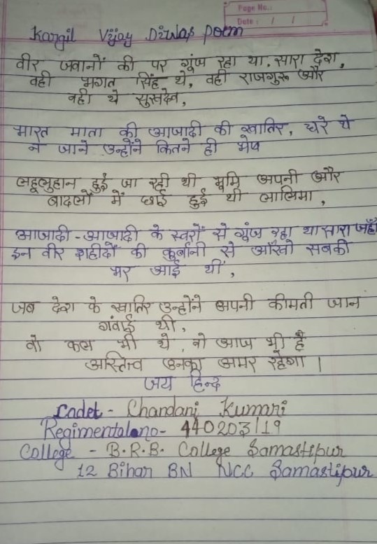 ;M CADET KUNNU KUMAR REG. NO. BR/20/SDA/440243, 12 BIHAR BN NCC SAMASTIPUR, GROU HQ MUZAFFARPUR, BIHAR AND JHARKHAND DIRECTORATE, PATNA