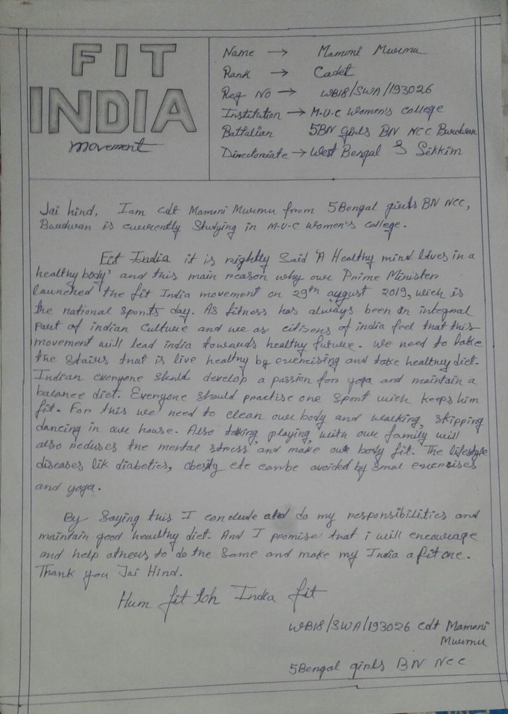 Topic-Fit India Name-Mamoni murmu Reg no-WB18/SWA/193026 Unit-5 Bengal Girls BN NCC Group- Burdwan Dt- West Bengal & Sikkim