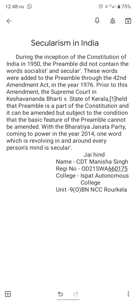 CDT Manisha Singh OD21SWA660175 Ispat Autonomous College 9(O)BN NCC Rourkela