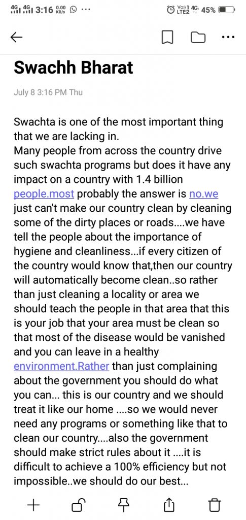 Cleanliness is very important for a country as it shows the mentality of the people of the country.everyone should do there due .We can clean small locality but whole country can be cleaned only if it's citizens are concerned.It is our duty.