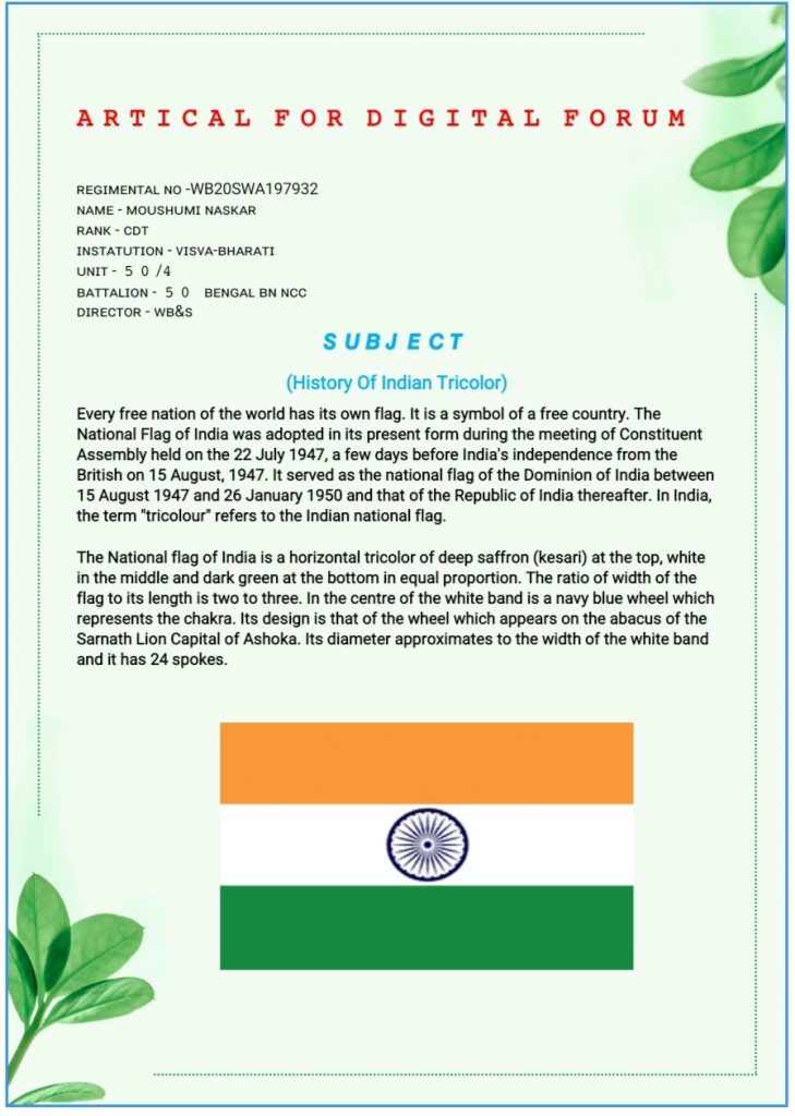 Name - Mousumi naskar No - WB20SWA198032 RANK - CDT INSTATUTION - VISVA-BHARATI UNIT - 50/4 BATTALION - 50 BENGAL BN NCC DIRECTOR- WB&S