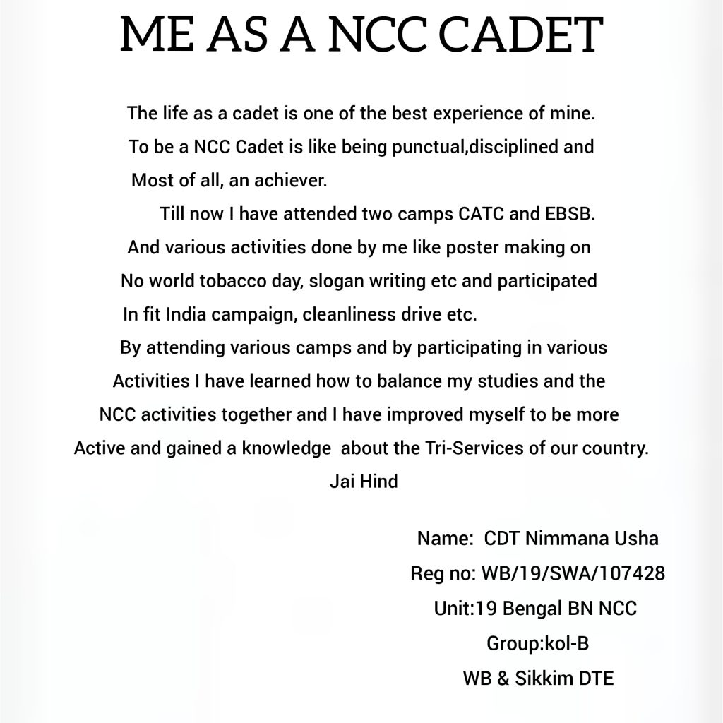 I am CDT Nimmana Usha from 19 Bengal BN Ncc, kol-B group, WB &Sikkim DTE .currently, I am pursuing graduation in B.A hons from khudiram Bose central college.I have attended CATC in 2020 and EBSB in 2020 respectively.