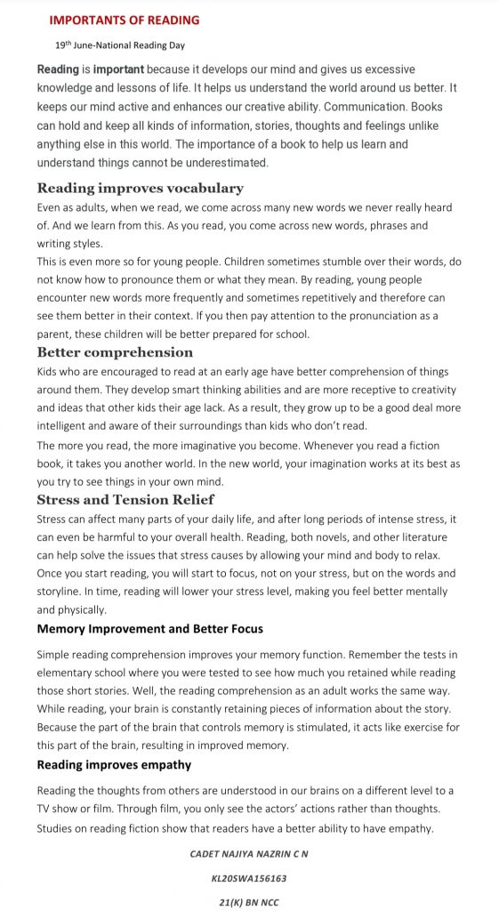 CADET NAJIYA NAZRIN C N KL20SWA156163 21(K) BN NCC GPTC KALAMASSERY K&L DIRECTORATE 8TH COMPANY.EKM Importance of reading