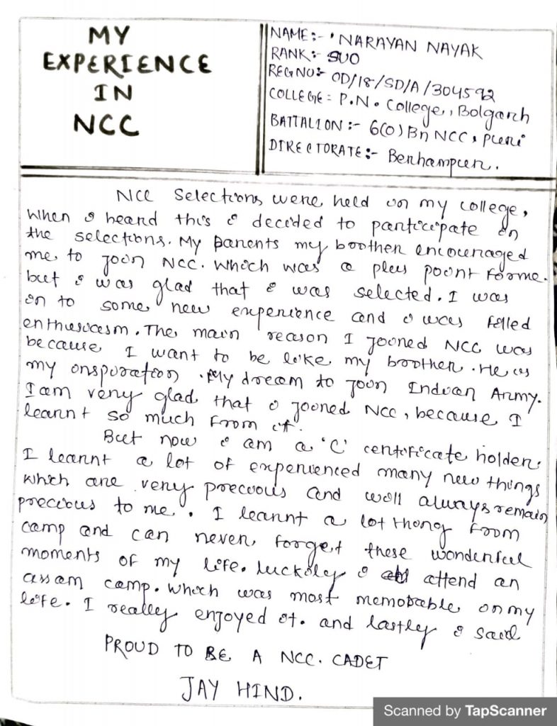 I am narayan nayak from 6(o) bn.ncc puri paramananda college, bolgarh, Khordha