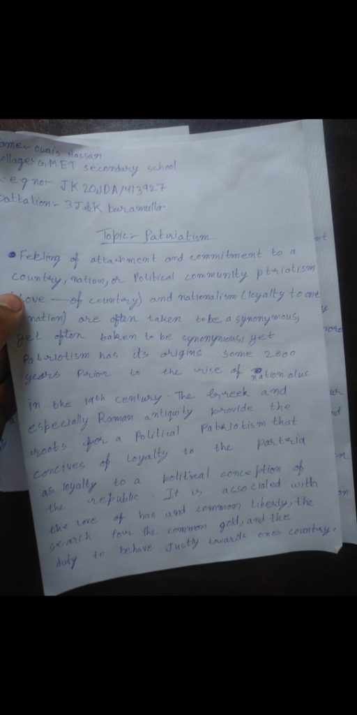 Owais Hassan G.M.E.T secondary school JK20JDA /413927 3rd J and K BN ncc Baramulla
