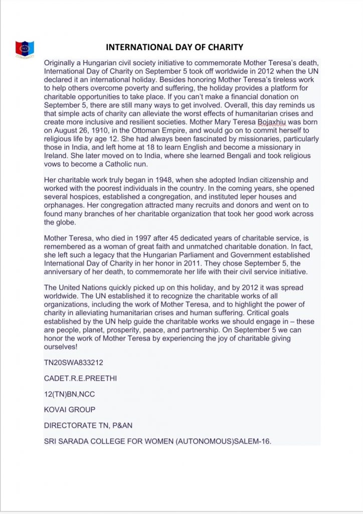 CADET.R.E.PREETHI TN20SWA833212 SRI SARADA COLLEGE FOR WOMEN (AUTONOMOUS)SALEM-16. 12(TN)BN NCC, KOVAI GROUP, TN,P& AN DTE.