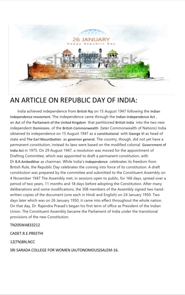 TN20SWA833212 CADET.R.E.PREETHI 12(TN)BN,NCC SRI SARADA COLLEGE FOR WOMEN (AUTONOMOUS)SALEM-16