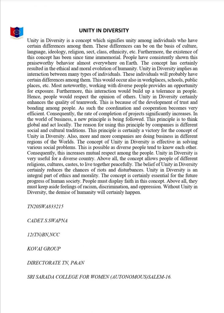CADET.S.SWAPNA TN20SWA833215 SRI SARADA COLLEGE FOR WOMEN (AUTONOMOUS)SALEM-16. 12(TN)BN NCC, KOVAI GROUP, TN,P& AN DTE.