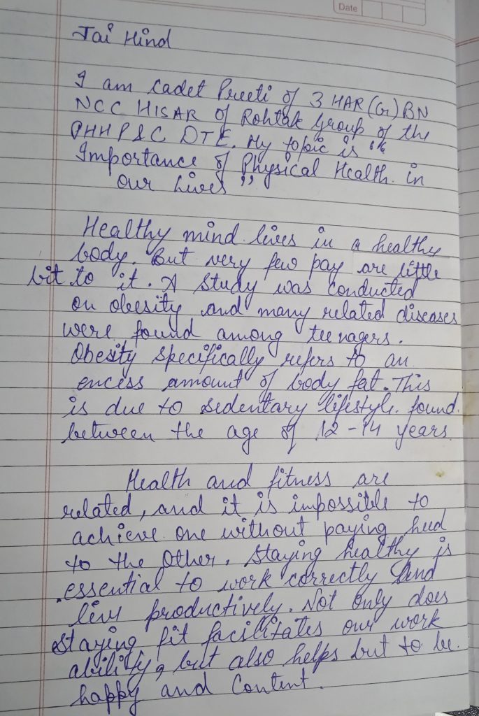 Jai Hind. I am cadet Preeti of 3 HAR(G) BN NCC HISAR Of Rohtak group of the PHHP&C DTE. My topic is \" Importance of Physical health in our lives \"