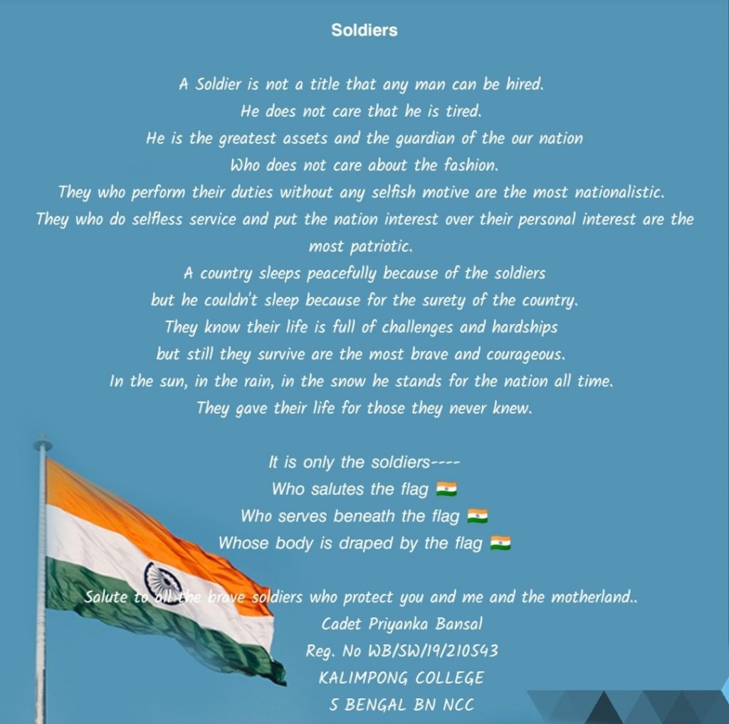 I am Cadet Priyanka Bansal of Kalimpong College and my regimental no is WB/SW/19/210543