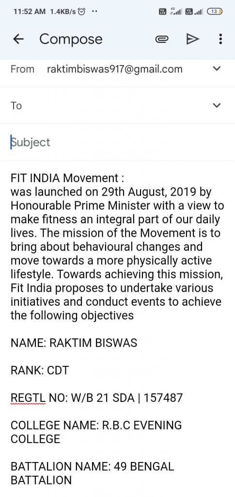 NAME: RAKTIM BISWAS RANK :CDT REGTL NO: W/B 21 SDA | 157487 COLLEGE NAME: R.B.C EVENING COLLEGE BATTALION NAME: 49 BENGAL BATTALION