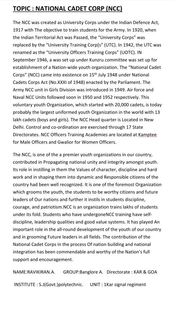 Unit : Kar Sig Regt NCC , Group HQ : NCC Gp HQ Bangalore A, Directorate : NCC Dte, Kar & Goa